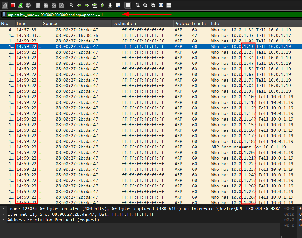 Notice in the image below that target IP addresses are requested in serial order and within a very short period of time.