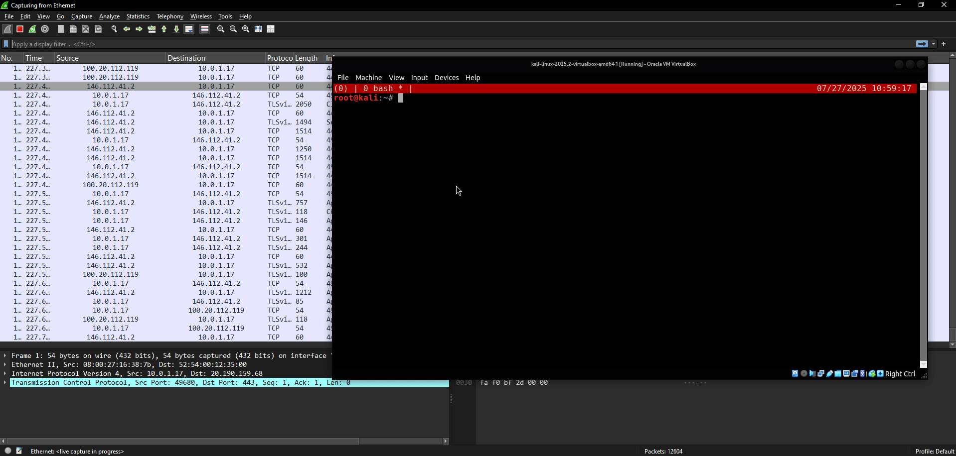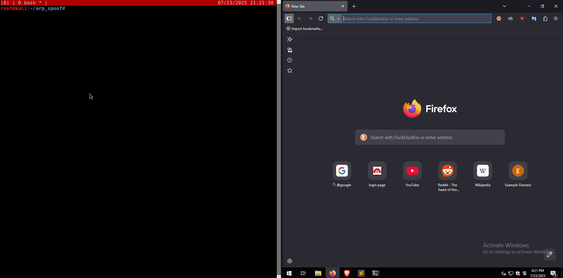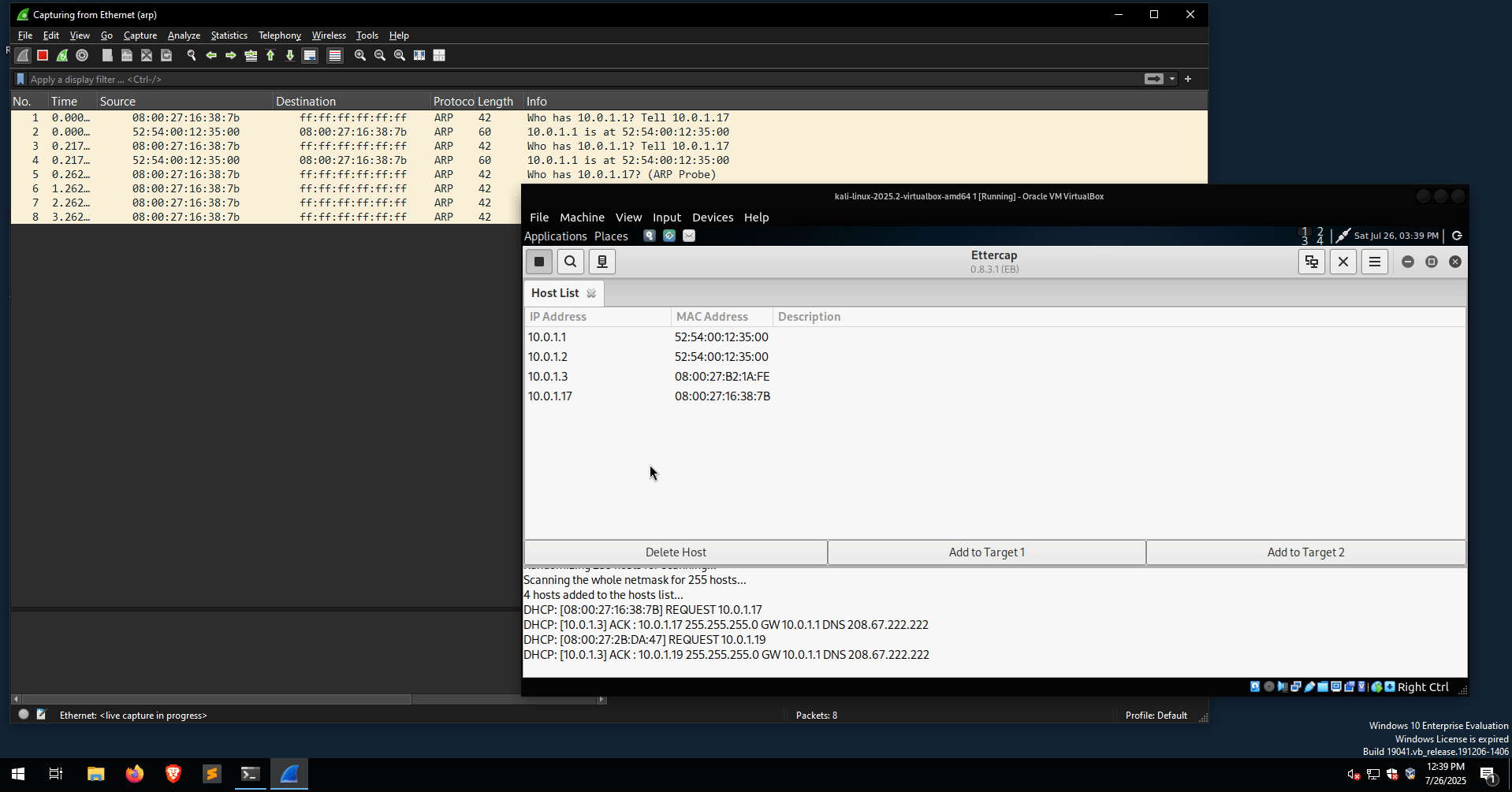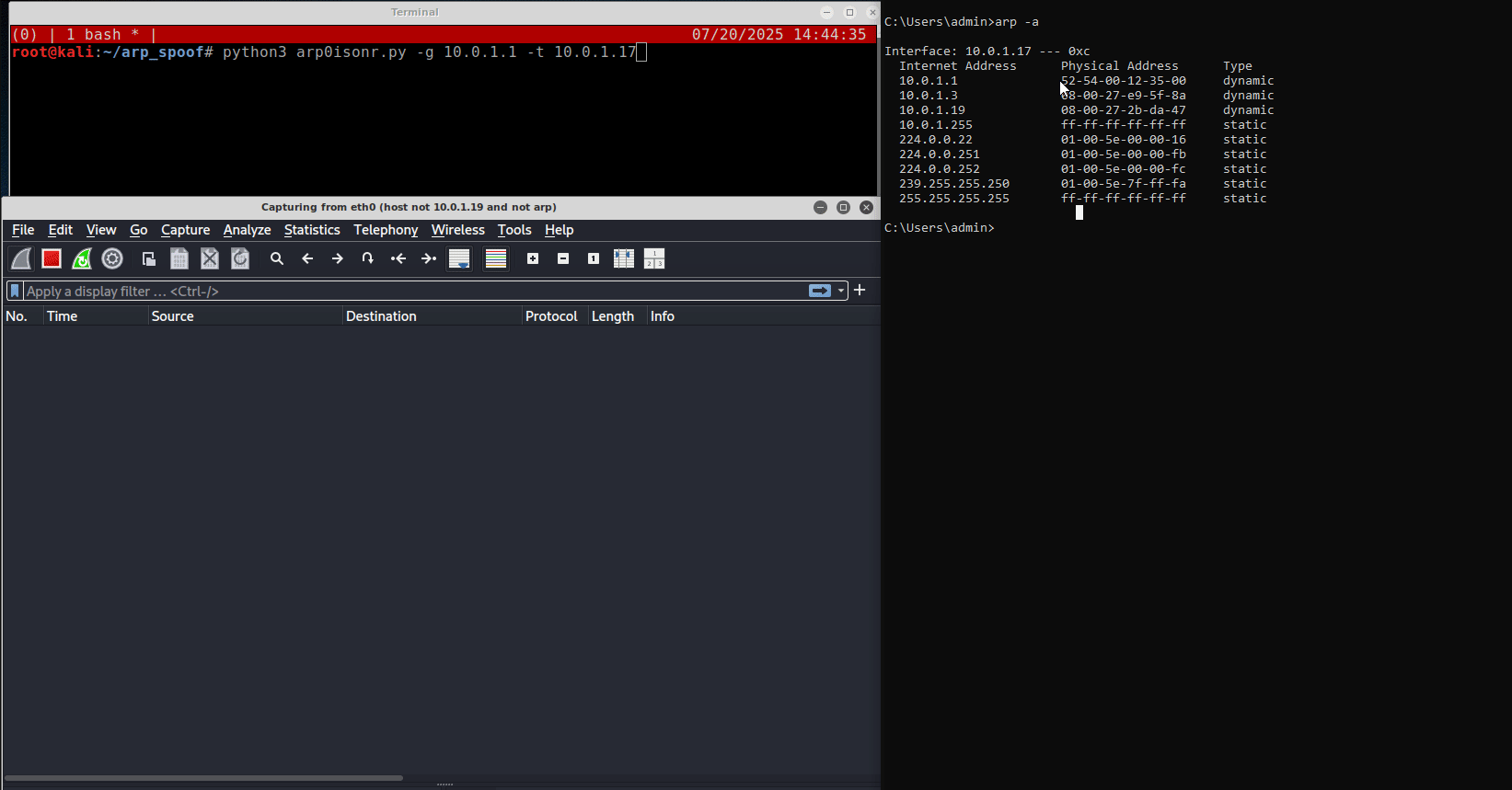 On the right side of the above figure is the victim, a standard Windows virtual machine, while on the left is the attacker’s box, which has a Wireshark instance running and a terminal window executing a Python script for the ARP poisoning attack.