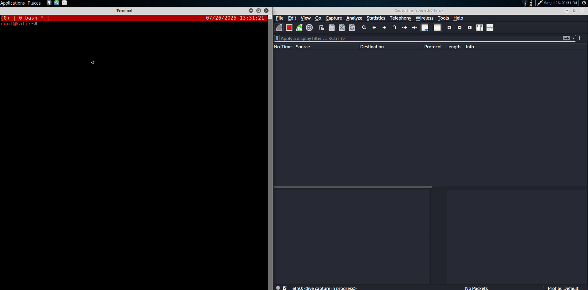 In the following example, a Wireshark instance is running on the victim’s box, sniffing for ARP traffic. This time, the ARP Poisoning attack is performed using Ettercap.