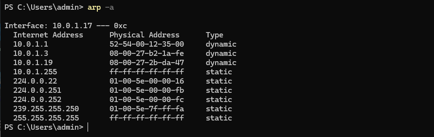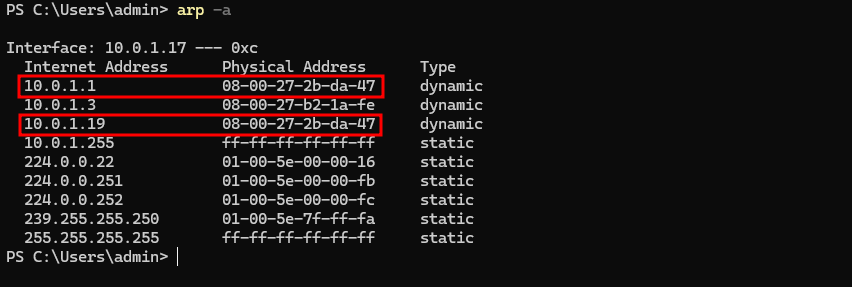 10.0.1.1has the MAC address52:54:00:12:35:00.After the script (i.e., the attack) is executed, the gateway’s MAC address changes to