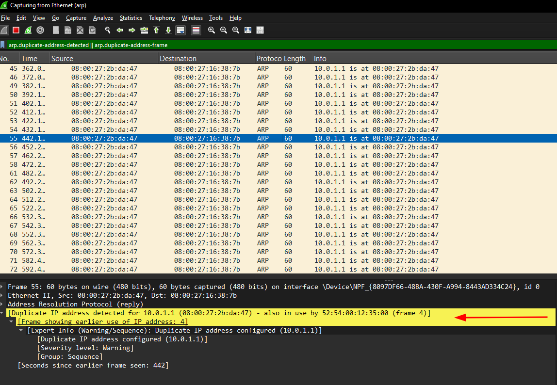 This filter detects duplicate IP addresses, meaning an IP address is associated with two MAC addresses, as can be seen in the following image: