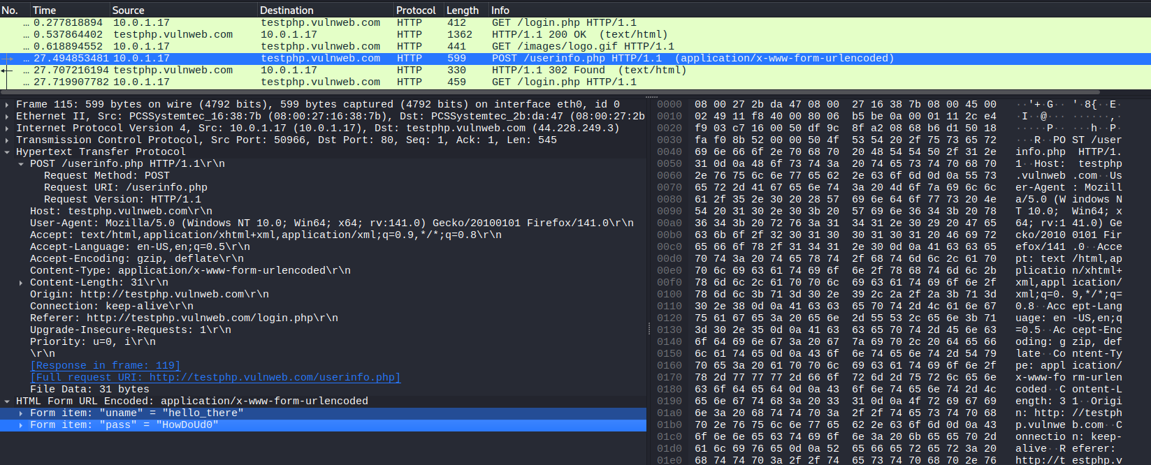 The above image shows clear-text credentials being intercepted after an HTTP login request to the classic vulnweb.com site.