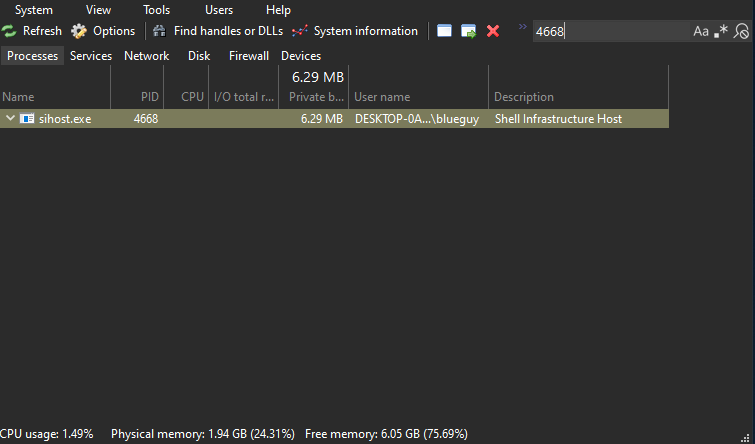 We also see the PID 4668 of the process where the shellcode was injected. We can check that PID on System Informer and see that the process is sihost.exe